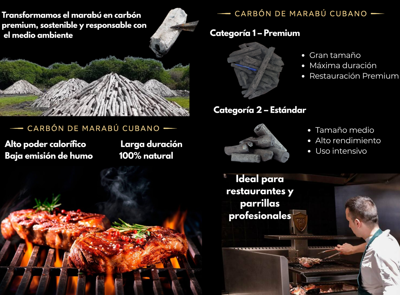 Carbón vegetal de marabú cubano de alto poder calorífico, larga duración y baja emisión de humo.